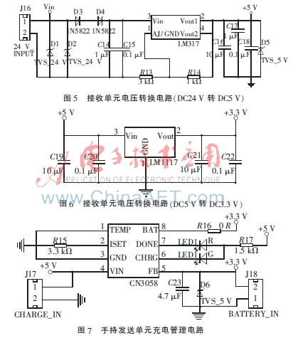 手持发送单元与接收单元的供电模块不同,前者采用DC3.3 V充电锂电池供电,后者采用采煤机上的DC24 V供电。供电电路如图5~图7所示。手持发送单元配以充电管理电路,采用红绿两个指示灯,充电状态亮红灯,充满后亮绿灯。