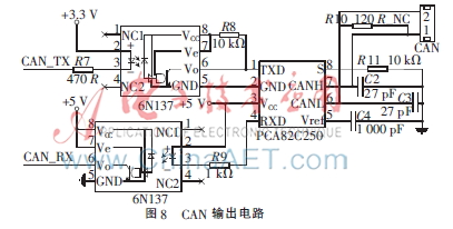 无线通信模块包括接收单元的CAN通信模块和RS485通信模块。STM32F103VCT6有内置的CAN控制器,因此只连接一个CAN收发器PCA82C250即可组成CAN通信电路。RS485通信模块采用MAX485作为电平转换芯片,与CPU的UART引脚相连作为RS485输出接口。为了提高信号的传输质量并保护核心电路,两部分电路都采用了光耦6N137做抗干扰和保护设计。CAN和RS485的接口电路如图8和图9所示。
