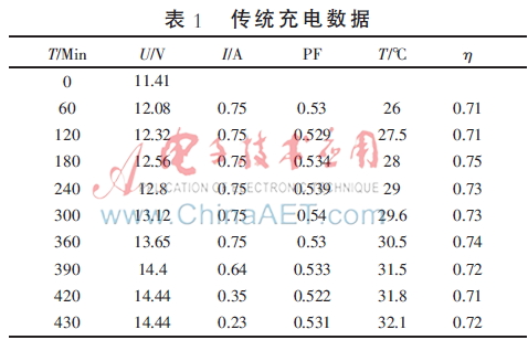 在本次试验中使用的充电器是传统的三段式充电器(规格为:12 V/1 A)。充电数据如表1所示,而本次快充数据如表2所示。