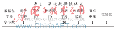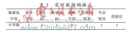 程序设计在应用层上实现,通过网络协议提供的标准函数实现数据发送。数据以数据帧的格式发送,在一帧数据中,除了传感器数据外,还要附加一些状态信息和控制信息。数据帧有两种格式,一种是完成10次测量后发送到网关的集成数据帧,其格式如表1所示;另外一种格式是接收到网关查询命令后发送到网关的实时数据帧,其格式如表2所示。