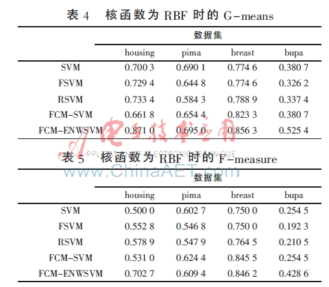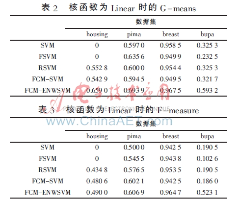 从表2~表5中可以看出,在不同的核函数下,FCM-ENWSVM的G-means、F-measure都高于其他方法。特别地,对于housing数据,当核函数为Linear时,SVM、FSVM的G-means、F-measure都为0,而FCM-ENWSVM的准确率相对较高。还可以发现,当多类少类的不平衡性差时,如bupa数据,SVM和FCM-SVM的结果相同,说明在FCM-SVM中,FCM并没有起到作用,准确率依然不高,而FCM-ENWSVM的却相对较高。FCM-ENWSVM利用了FCM算法,并考虑到用权值来改善数据的类别不平衡度,从而解决了FCM不平均分组再次造成数据不平衡的问题,有效地提高了分类准确率。
