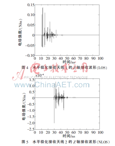 比较图2和图3可以看出,由于视距传播直射路径直接到达接收点,无阻碍物的限制,因此到达接收天线1的时间要比非视距传播到达接收天线2的时间短。在视距传播中,在直射区域直射路径最先到达且信号最强,在全部的多径信号中占绝大部分能量;在非视距传播中,没有直射路径,透射路径最先到达。