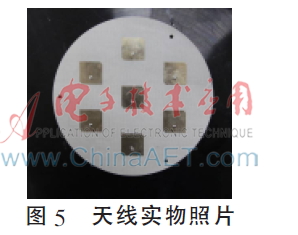 此天线阵列共有7个天线单元,其中中间的天线单元为发射天线,周围6个为接收天线。根据此布局对天线特性进行了仿真。天线的介质板是Taconic生产的TRF-43介质板,厚度为64 mil,即1.63 mm,介电常数为4.3,覆铜厚度为1 oz/ft2。同轴连接器为50 Ω SMA连接器,直径为200 mm,辐射贴片边长为28 mm,接地板边长为40 mm,馈电点的位置距离相应接地板中心6 mm,切角大小为3.0 mm和3.1 mm,周围天线单元距离中心天线单元的尺寸为半波长。