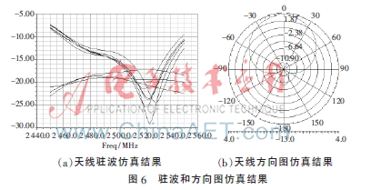 通过仿真计算对天线阵列进行了实际的制作,如图5所示。天线的方向图和驻波图的仿真结果如图6所示。