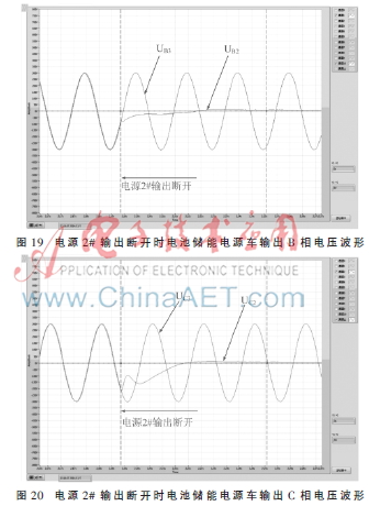 从测试波形可以看出:电池储能电源车在电源1#输出断开和电源2#输出断开两种情况下输出电压波形均未发生异常。测试结果表明电池储能电源车运行状态良好,可保障所带负荷零间断运行。