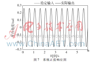 当给输入一个正弦控制信号时,正弦控制信号的幅度为π/12,设置频率为2 Hz。正弦控制信号的输出响应图如图7所示。由图7可以看出,给定输入灰色部分与实际输出黑色部分几乎重合,因此系统具有较好的动态性能和跟踪性能;系统稳态误差如图8所示,由此可以看出系统的稳态误差小于0.008,说明系统的稳定性较好。