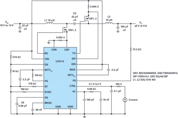 图1.基于LT8714的双象限电源的电路图,6 A时,其VIN 12 V,VO ±5 V。