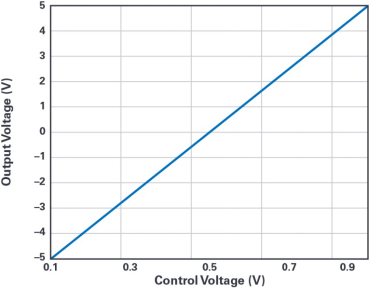 图4.输出电压VOUT与控制电压VCTRL的关系图。当VCTRL从0.1 V增加至1 V时,VOUT从–5 V逐渐变化到+5 V。