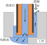 试验所选取的零件如图1所示,深径比为12:1,异形孔入口处为平面,出口处为半通半盲孔。电解加工过程中,工具阴极接电源负极,工件接电源正极,工具阴极以一定速度向下进给,电解液高速流过工具阴极与工件形成的加工间隙,带走加工产物及焦耳热,工件一侧发生电化学溶解,实现工件加工成形,工具阴极外侧涂覆绝缘层以防止加工过的孔壁发生二次电解。