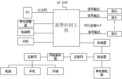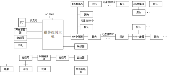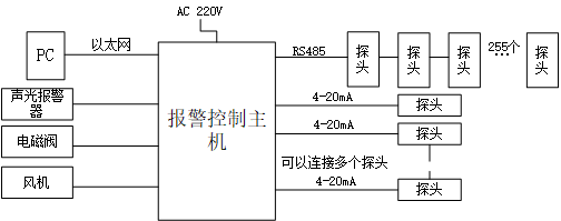 气体报警控制系统包括气体检测探单元、信号传输采集单元、显示单元(报警控制主机上集中显示)、监控器、控制单元、报警单元、被控设备单元(如风机、电磁阀)组成。气体检测探头将现场检测到的气体浓度转为标准信号,如4-20mA或者RS485等信号,然后将信号输送到报警控制主机上进行统一显示。两种通讯形式的组网框图如下图2与图3所示。