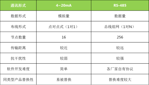 RS-485传输的特点:相对于模拟量信号,RS485的响应速度较慢。但是RS485通讯可以传输较大位宽的数据,可以传输较多的数据内容。另外在布线上,RS485信号的采集可以采用一对多的总线方式(只用两条线就可以采集多个信号量),RS485信号的传输距离也较远,抗干扰能力也较强。行业产品将逐渐由4~20mA替换为RS-485总线形式。