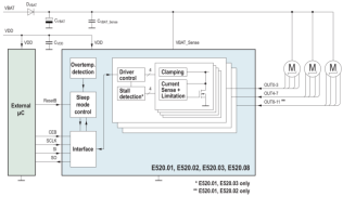 6)高低边驱动:NXP的MC40XS6500(高边)、ELMOS的E520.02(低边),其中高边输出有6个通道,低边输出有12个通道,每路输出都具有保护功能,可以直接驱动继电器,小功率电机或灯泡,应用框图如下所示: