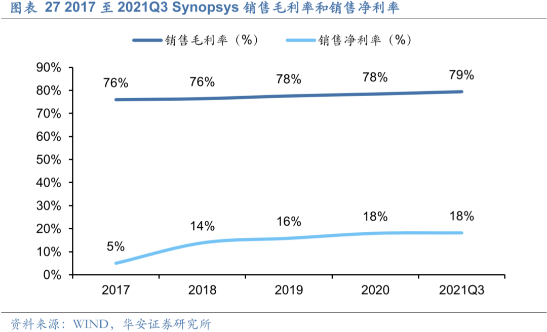 EDA产业技术壁垒高筑,EDA软件业务享受近90%毛利率。正如前文所说,EDA是算法密集型产业,需要对数千种情境进行快速设计探索,涉及计算机、数学、物理等多基础学科的结合应用。这种基础学科技术的不断突破和应用,需要通过长时间的技术研发投入和专利积累来实现。目前,头部企业对EDA的长期高强度的技术研发投入成为其保持长久竞争力的关键之一,成熟的EDA企业纷纷形成了极高的技术壁垒。过去十年间,世界头部EDA企业Cadence和Synopsys的研发投入始终保持在30%以上。另一方面,超高的研发投入与技术壁垒让行业内的企业享受到了近90%的毛利率,行业内头部企业Synopsys和Cadence的总体毛利率常年维持在80%左右,并呈现持续上升的趋势。