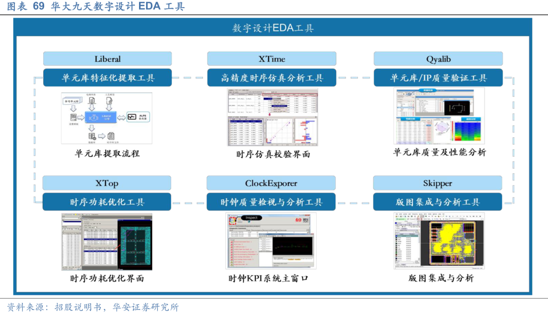 公司在数字电路设计领域具有数个有特色的点工具。其中,在单元库特征化提取阶段,公司可提供Liberal工具和单元库/IP 质量验证工具Qual,该工具为设计师加速单元库的设计和优化提供了重要支撑;在高精度时序仿真分析阶段,公司可提供XTime工具,该工具大大提高了分析电路时序的可靠性;在时序功耗优化工具的开发上,公司推出了自研的XTop工具,该工具能显著提高时序和功耗优化的效率和质量;在版图集成阶段,则形成了Skipper工具,该工具为高效的分析和处理超大规模版图数据提供了有力支撑。