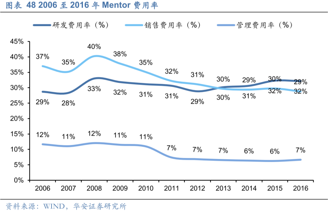 研发费用率稳步上升,获取持续竞争力。Mentor 2012年以来,研发费用率稳定抬升,销售费用率持续下降。从研发费用角度,Mentor研发费用主要体现在两个方面,一方面是对已有产品的持续改进和新产品的开发,另一方面在于通过兼并收购来扩大现有产品,并寻求新的业务领域。由Mentor年报可知,员工薪酬和兼并收购费用是研发费用的主要组成部分,公司对核心技术研发人员的高投入与兼并收购是公司在EDA市场中长期取得竞争优势的重要原因。从销售费用角度,销售费用绝对值相对稳定,在公司营收稳步增长的情况下,销售费用率有所下降。此外,公司海外市场持续扩大,公司销售费用率的降低一定程度上能够反应公司在EDA市场具有销售渠道优势,并且其海内外市场进一步成熟,有利于销售费用率的降低。