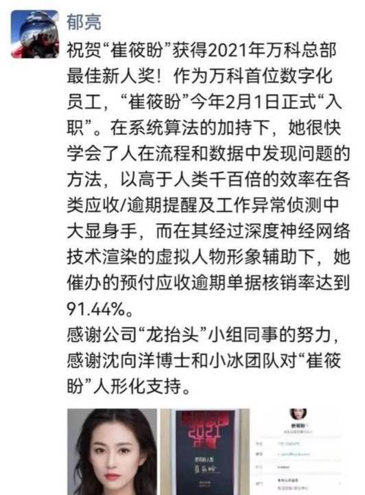 日前,万科集团董事长郁亮在自己朋友圈推出了今年万科总部的一位“最佳新人”奖——万科首位数字化员工“崔筱盼”。据介绍,崔筱盼的主要工作是负责应收账款的催收,在“她”的催办下预付应收逾期单核销率达到91.44%。