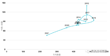 图10为碳纤维基础相关专利技术生命周期图,其反映了一定时间内,从事碳纤维研发主体(高校、企业等)数量以及专利产出数量的关系图,一般而言,研发主体和专利产出均逐渐增多,说明该技术呈现“膨胀”即扩张期、上升期,反之则处于下降期、衰退期,从图10中可以看出,近几年,碳纤维研发整体上呈现双降趋势,进入萎缩期或衰退期。