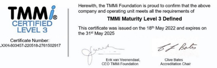 整体测试经过差距分析、测试改进和优化、项目试点、预评估与正式评估等一系列实施阶段,于近日顺利通过TMMi3级认证。