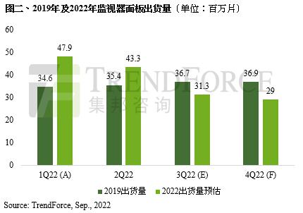 不过,显示器面板在第二季有品牌递延交货(Back order)的支撑,且疫情管控对显示器整机组装产能影响不大,故终端需求衰退与库存问题直至第三季才发酵。在品牌积极去化库存之下,第三季显示器面板出货量将大幅衰退,预估出货量下滑至3,130万片,季减27.7%,低于疫情前2019年同期的3,670万片。
