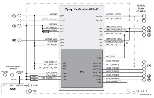 例如,下面是 AMD-XilinxZynqUltraScale+ MPSoC 所需的电源图,这是一种将 FPGA 与基于处理器的 SoC 相结合的 SoC: