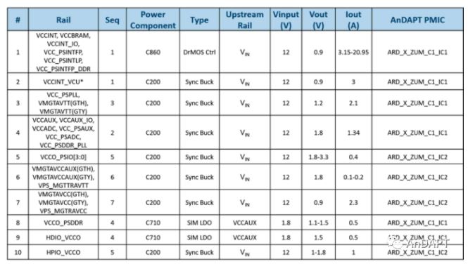 例如,AnDAPT为 Zynq UltraScale+ MPSoC 设计了一个使用AmP芯片的两芯片电源子系统设计,如下表所示: