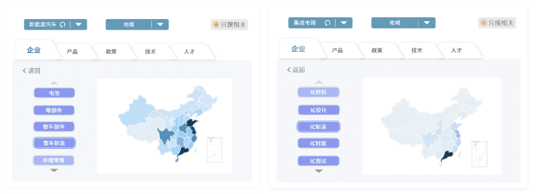 本次更新对新能源汽车与集成电路产业链信息的拆解与串联,用户可在下图中的搜索组件内选择想要查看的行业与地域,通过“企业、产品、政策、技术、人才”五类标签,即可实时、直观了解两大产业环节在各个地域的热门程度、产品描述与供需情况、政策更新动态、技术走势和人才薪酬方面等信息。