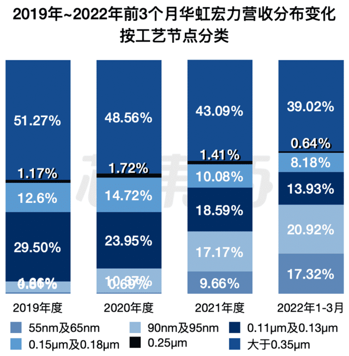 而华虹最先进的工艺是55nm,不过靠的主要是90nm以上工艺来赚钱。按照2022年1-3月的数据,55/65nm占17.32%,其它的全部是90/95nm以上工艺,90nm+的工艺占到80%+。