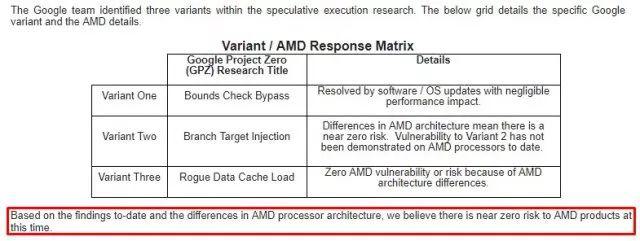 AMD在给CNBC的声明中称,“对于分支预测的三种攻击方法只部分影响AMD,由于和英特尔架构不同,在此时,我们相信AMD处理器接近零风险(near-zero risk)。”