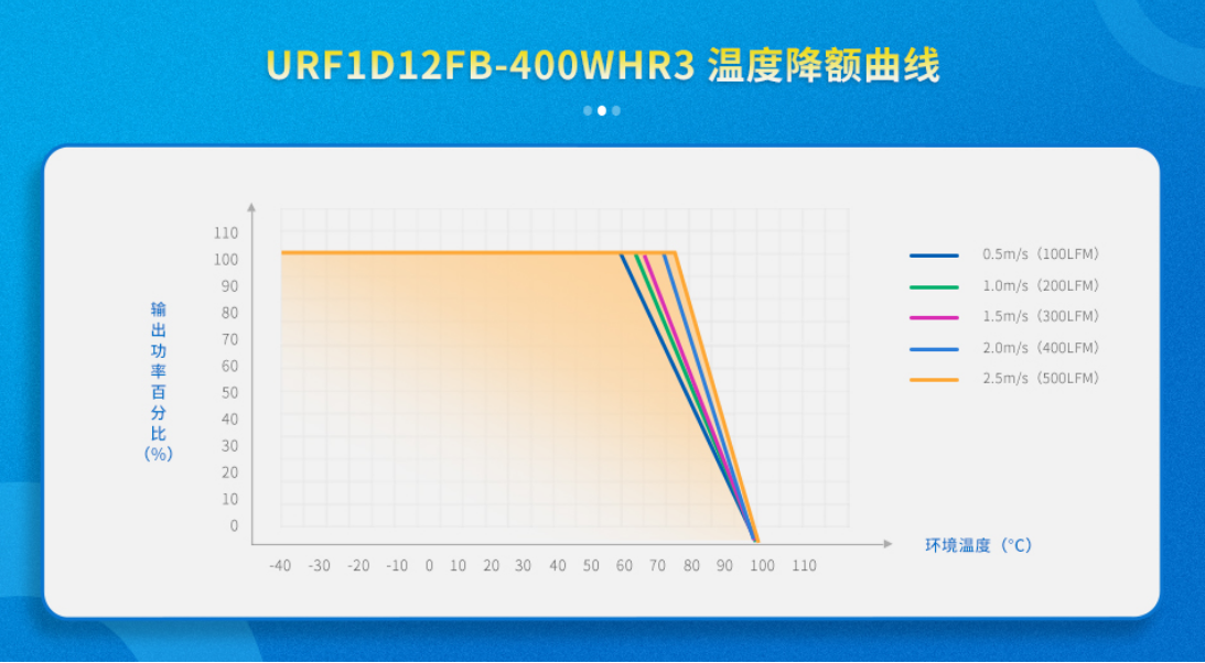 URF1D_FB-400(H)WR3系列工作温度范围宽至-40℃ to +100℃,具有优异的温度降额曲线,带来的器件发热量低,大大提升产品的寿命和可靠性。