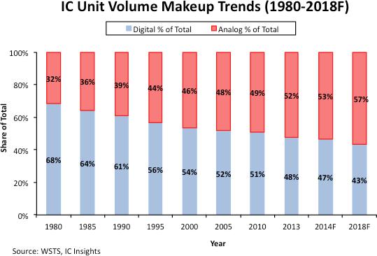 但这并不是唯一的方向,单一功能的模拟芯片仍然有很大的生存空间。市场研究机构IC Insights的数据显示,以出货量计,模拟芯片占比过半,出货量前五大的子类产品中,有四种属于模拟产品。