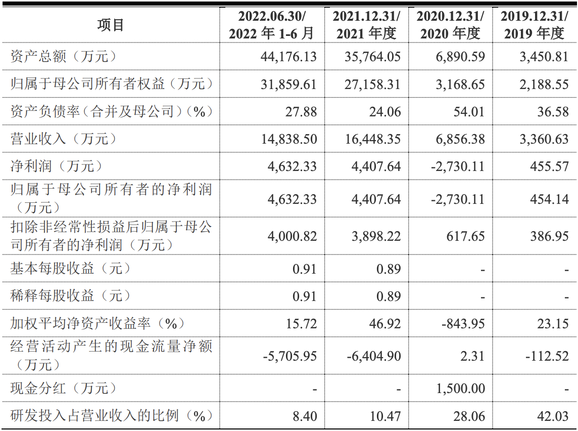 2019年、2020年、2021年和2022年上半年,埃科光电的营收分别为3360.63万元、6856.38万元、1.64亿元和1.48亿元;净利润分别为455.57万元、-2730.11万元、4407.64万元和4632.33万元,扣非后净利润分别为386.95万元、617.65万元、3898.22万元和4000.82万元。