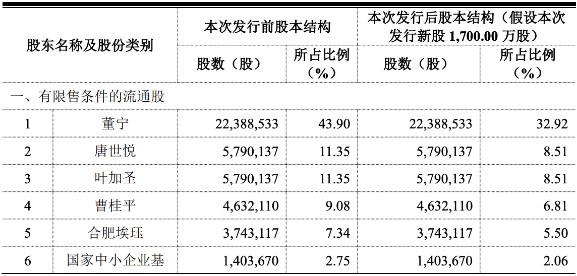 此外,唐世悦、叶加圣均分别持股11.35%,曹桂平持股9.08%,国家中小企业基金持股2.75%,中小企业基金同创(合肥)持股2.66%,芜湖市镜湖高投毅达持股1.83%,合肥敦勤致信持股1.61%。