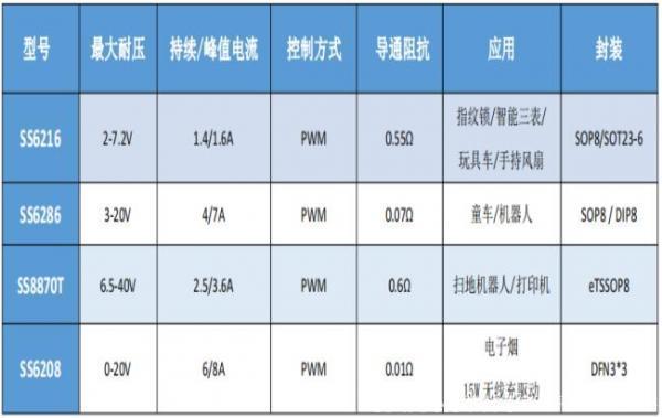 SS6286是一款直流有刷马达驱动芯片,持续输出电流可达4A,峰值电流可达7A,耐压可达3-20V,导通阻抗可达0.07Ω。