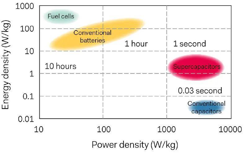 然后,超级电容还有一个需要解决的问题就是它们缺少能量密度。当锂蓄电池的能量密度达到265千瓦时,超级电容目前为止只有其十分之一的能量密度。