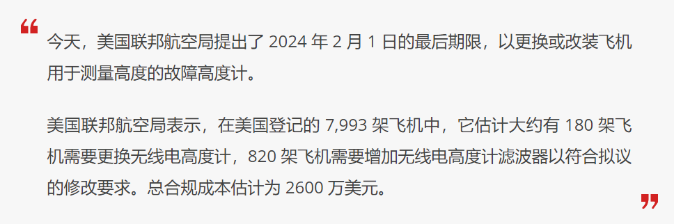 5G 信号干扰导致 180 架飞机需更换高度计,FAA 决定推迟整改方案至 2024 年 2 月