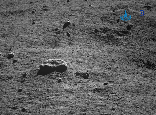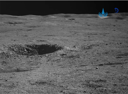 另外两张图片分别是距离月球车约4米处的一块石头,大小约为25厘米;距离月球车约37米处的一个小型撞击坑,直径约5米。