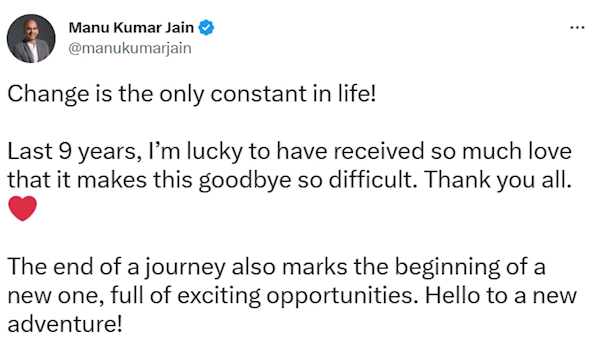 对于下一阶段的人生旅程,Manu Kumar Jain表示:在接下来的几个月里,我会休息一段时间,然后再接受我的下一个职业挑战。我是一个建筑爱好者,我希望在一个新的行业里创造一些新的东西。