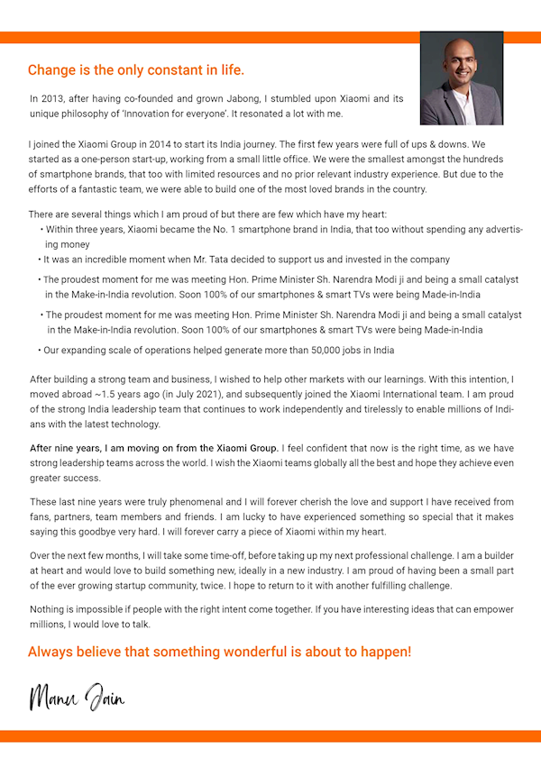 今天,小米集团成为印度头部智能手机供应商的高管、小米集团全球副总裁Manu Kumar Jain(马努·库马尔·贾因)在社交平台发文宣布,已在小米供职9年的他将离开公司。