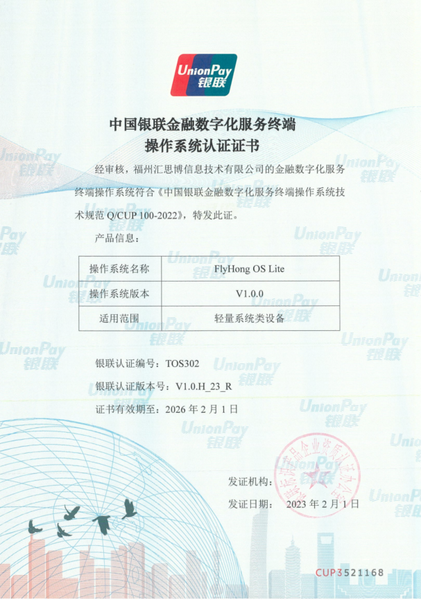 基于开源鸿蒙 OpenHarmony,汇思博 FlyHong OS Lite 获批中国银联金融数字化服务终端操作系统认证