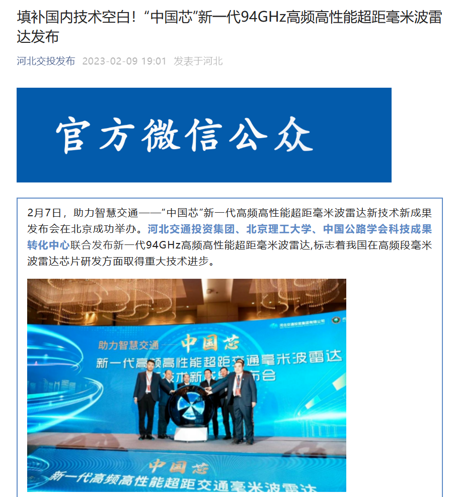 河北交通投资集团、北京理工大学、中国公路学会科技成果转化中心联合发布了新一代 94GHz 高频高性能超距毫米波雷达,标志着我国在高频段毫米波雷达芯片研发方面取得重大技术进步。