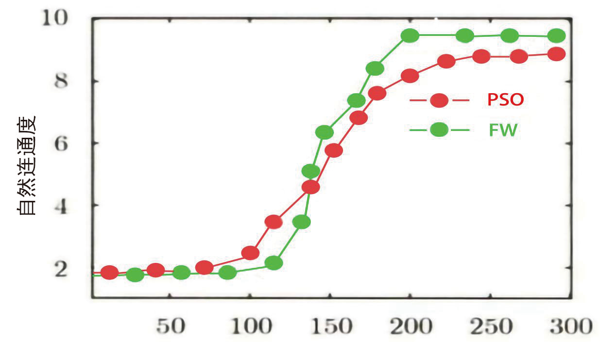 最后,进行连通性对比实验,其实验结果如图2 所示,对该结果进行分析可以得知:网络结构中自然连通度与进货代数呈现正相关,即随着进化代数的增加,自然连通度也会随之增加,在运用FW-PSO 算法时,两者始终呈现着一一对应的关系。从该实验结果中可以看出,基于FW-PSO 算法的网络拓扑结构优化,一方面可以使无线传感网络的抗毁性得以提高,另一方面还可以使算法的收敛效率得以保证。