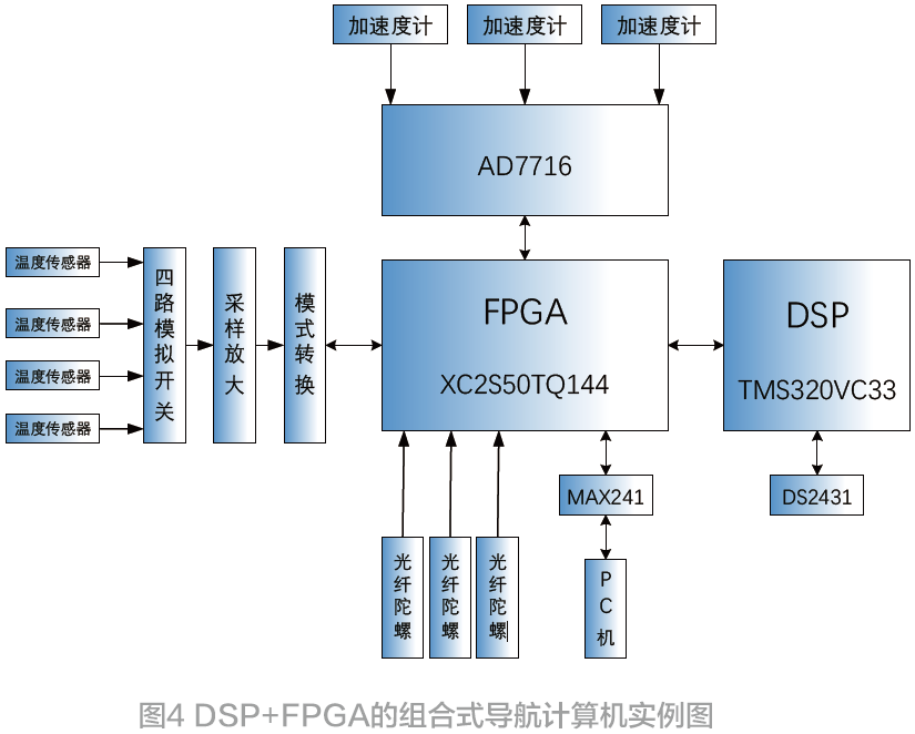 哈尔滨工程大学的杨枭以“DSP+FPGA”作为双核心的硬件架构,设计了基于光纤陀螺的捷联导航数据处理系统[18]。由FPGA 完成数据采集后,用多余的资源代替DSP 进行滤波工作,DSP 只承担接收数据后的解算。由于光纤陀螺零漂、标度因子的性能指标对温度变化十分敏感,必须引入温度采集模块来进行温度补偿。整个系统工作过程中,可以通过引入中断响应来给FPGA滤波时间,完成任务后向DSP 提出中断请求,再由DSP 来读取数据[19]。特别的是,光纤捷联惯导系统数据采集模块含有模拟电路,而惯导核心解算模块为数字电路,应使用光电耦合器,隔离数据采集模块和导航计算机模块,从而提高电路可靠性和性能指标。