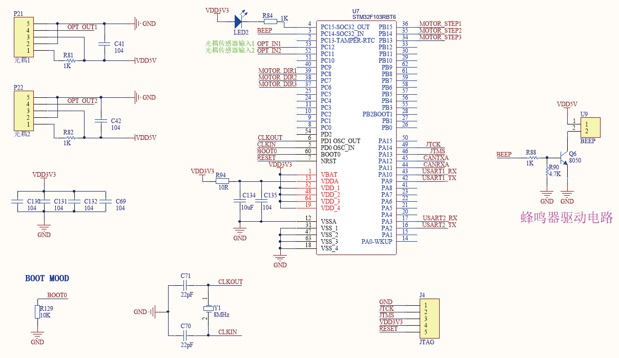 1)MCU 最小系统模块:本控制系统选取STM32F103RBT6 做主控芯片, 其主频为72 MHz、RAM 为20 kB、FLASH 为128 kB;其外设包括2 路USART、1 路CAN、51 路IO;由于面板执行机构程序中没有较复杂的数学算法, 其性能完全满足开发需求。在设计MCU 最小系统时首先将MCU 相应的电源引脚连接至3.3 V 电源和GND;然后PIN5 和PIN6 连接8 MHz 晶振和22 pF 滤波电容;同时将PIN60(BOOT0)引脚拉低,表示单片机复位后, 程序将从Flash 启动;最后将下载口引脚(JTCK、JTMS、RESET)扩展出来用于程序的下载。同时在最小系统模块中设计了LED 电路和蜂鸣器电路用来表示执行机构的运行故障。