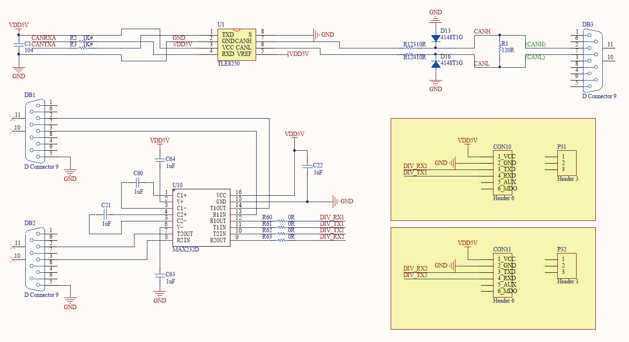 3) 通信模块: 面板执行机构和DTU通过无线USART模块进行通信, 其通信协议满足Modbus RTU规范。同时我们扩展1 路CAN用于执行机构的程序在线升级, 扩展2 路USART 用于和电脑进行离线数据上传及调试。在这里选择MAX232D 芯片,将TTL 电平转换为RS232信号;选择TLE8250芯片,将TTL电平转换为RS485信号。