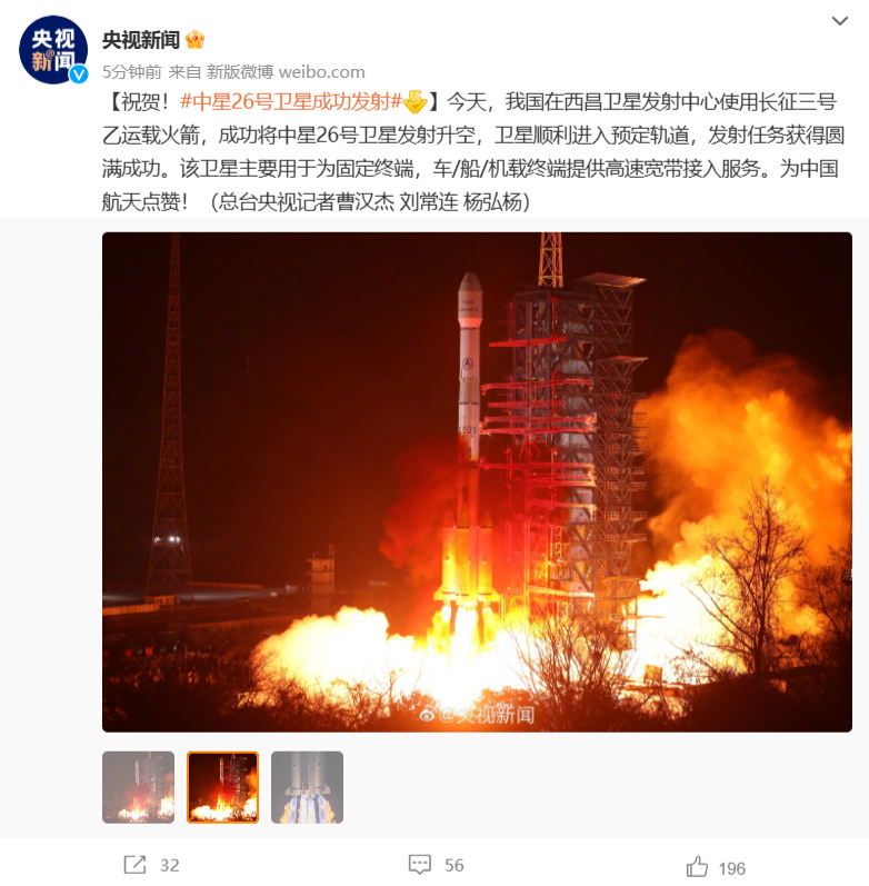 IT之家 2 月 23 日消息,据中国航天报报道,北京时间 2 月 23 日 19 时 49 分,长征三号乙运载火箭(简称“长三乙火箭”)在西昌卫星发射中心点火升空,将中星 26 号卫星顺利送入预定轨道,发射任务取得圆满成功,这是长三乙火箭 2023 年首战首胜,也是长征系列运载火箭农历癸卯年的首战首胜。