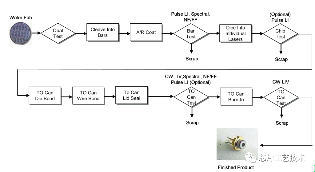 第三步做AR面和HR面镀膜,然后进行Bar条测试,测试后可分成单独的芯片颗粒。