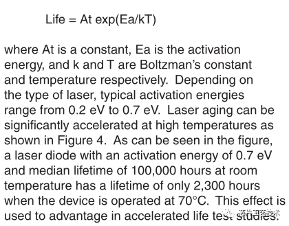 如上图同是Ea=0.7eV的激光器,在室温20℃下的寿命是10万小时,但是在70℃下只有2300小时。