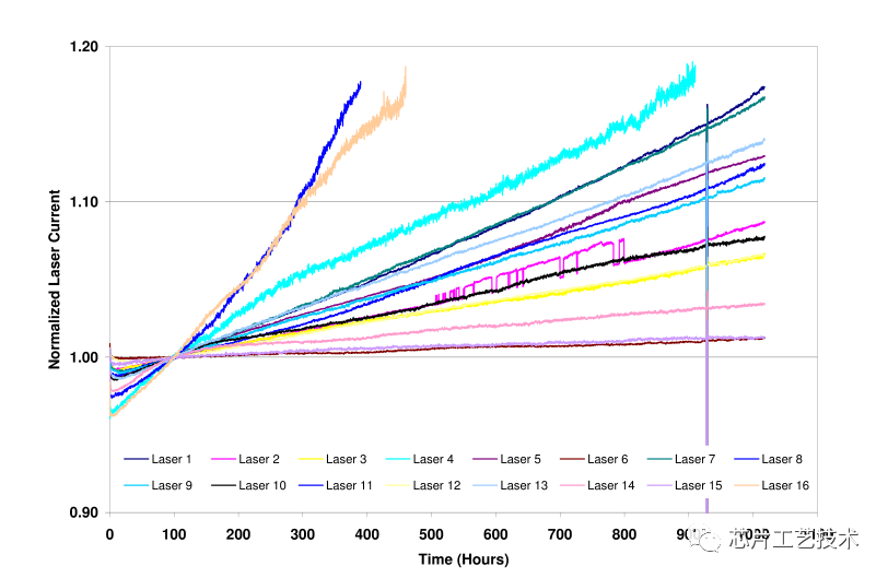 通常在测试开始前几百小时老化速度最快,后来是一个稳定的线性老化特性,每一个激光器的使用寿命在线性区都是一条直线。所以可以推断出预定义电流下的使用寿命。