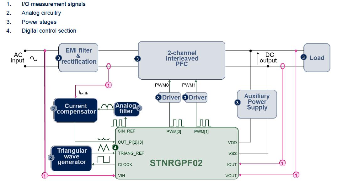 3. STNRGPF02实现混合信号(模拟/数字)控制,将可编程高端数字解决方案的灵活性与模拟组件的响应性和准确性相结合。内部电流环路由一个模拟比例积分(PI)补偿器组成,确保最高的带宽和周期的周期调节。外部电压环由具有快速动态响应的数字PI控制器实现.