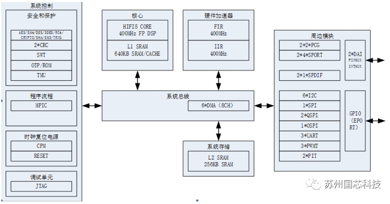 CCD4001芯片对标ADI的ADSP-21562,采用HiFi5核心架构,工作主频400MHz,芯片内置640KB L1 SRAM和256KB L2 SRAM,支持多种数字音频接口(SPORT、SPDIF)和滤波器硬件加速器(FIR、IIR),支持SPI、QSPI、OSPI、I2C、UART、PWMT、PIT、GPIO(EPORT)等多种外设接口,并支持应用程序的安全保护机制。为音频放大器、主机、ANC/RNC、后座娱乐系统、数字座舱应用等提供卓越解决方案。